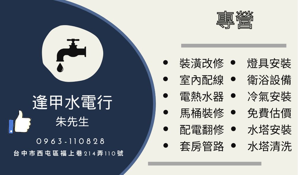 專業水電服務,台中西屯逢甲信賴推薦!我們提供公司水電、水電修繕,以及北屯區水電服務。需要水塔安裝清洗或冷氣安裝?我們擁有豐富的經驗和專業技術,為您解決各種水電問題。此外,我們也提供套房及室內裝潢管路、電燈電器安裝、衛浴設備裝修等服務,打造舒適、安全的居家環境。立即聯繫我們,讓專業團隊為您提供最佳解決方案!